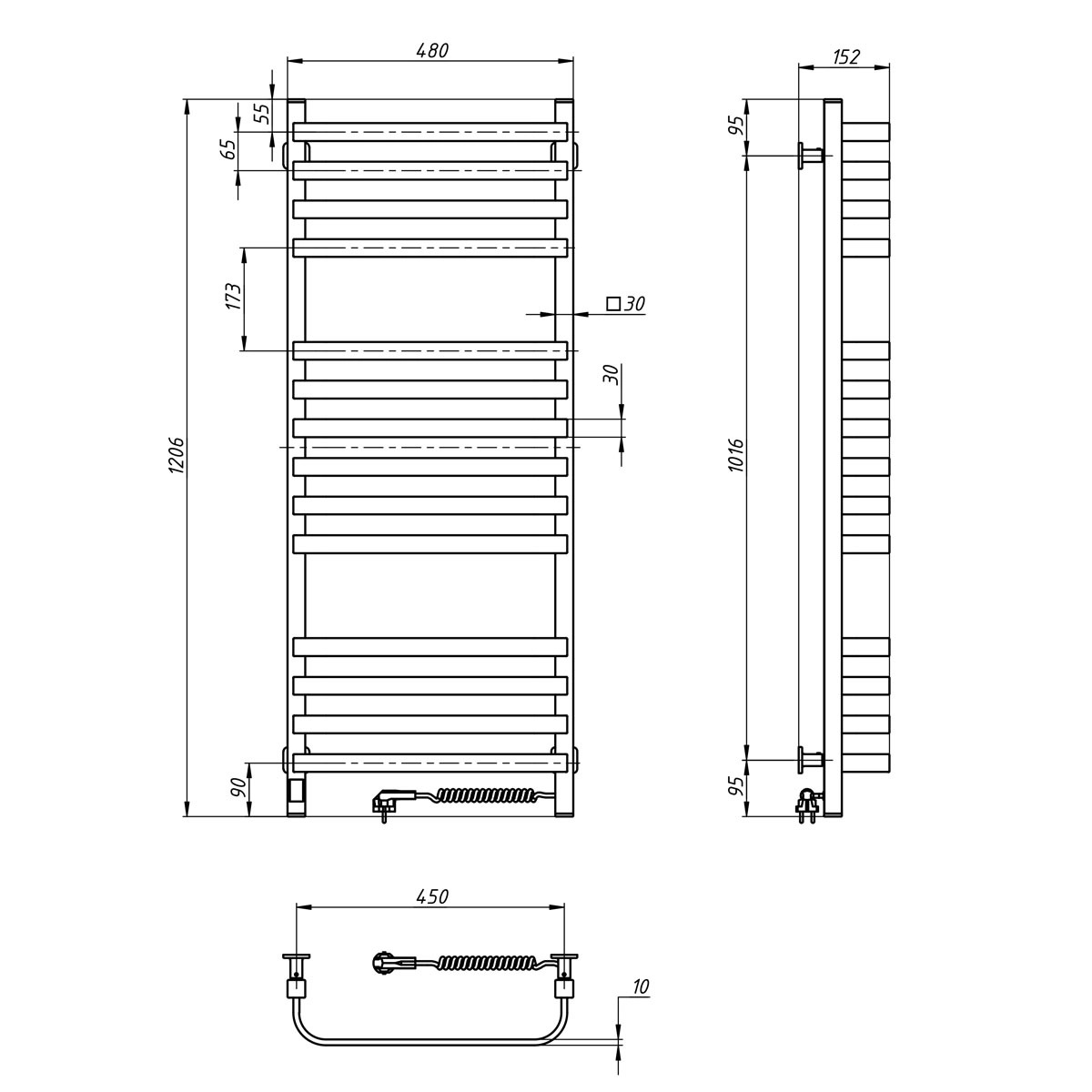 Електрична сушка для рушників Navin Stugna, колектори якого виконані з профільної квадратної труби 30х30 мм, а перемички з прямокутних вигнутих трубок 30х10мм. Вигнуті і винесені на 8 см вперед прямокутні перемички підвищують конвекційну дію, що підвищує функціональність сушки для рушників Navin Stugna.